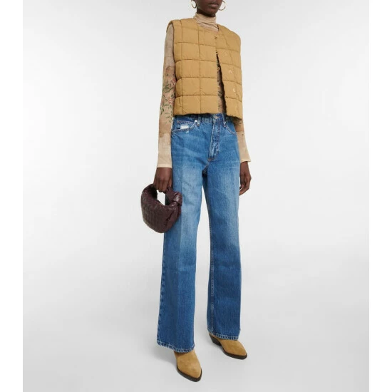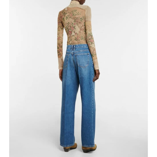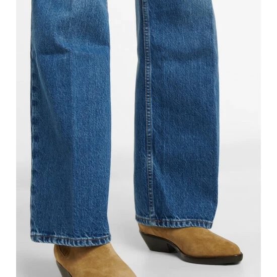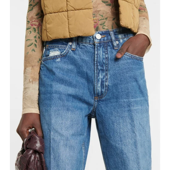 The Pixie High ‘n’ Tight jeans from Frame are a wide-leg silhouette with gentle distressing at the pockets and waistband. They’re made from non-stretchy cotton denim in a dark-blue wash.