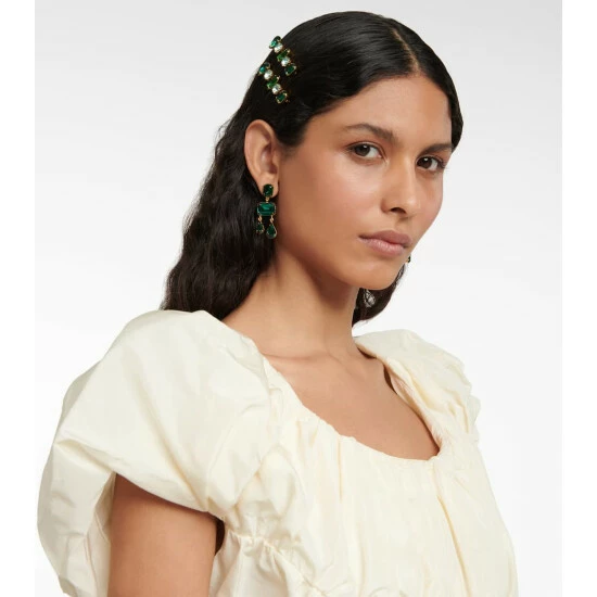 Sophistication and romance are the hallmark of Jennifer Behr, whose accessories are made by hand in the label’s New York City ateliers. The Lucille earrings are a classic design, embellished with emerald-green crystals that glitter with every sway of your head.