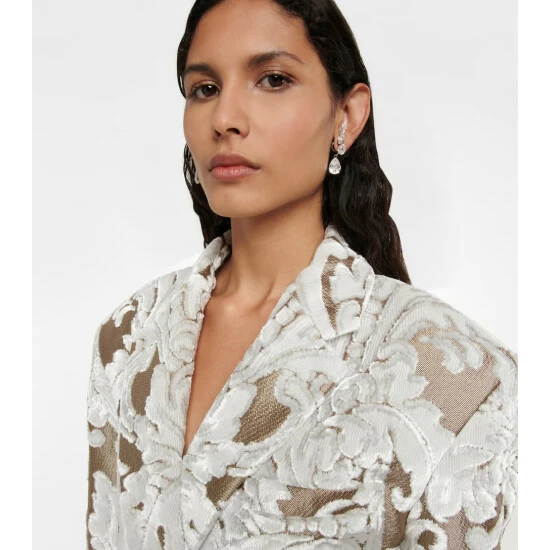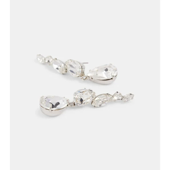 Sophistication and romance are the hallmark of Jennifer Behr, whose accessories are made by hand in the label’s New York City ateliers. A row of sparkling teardrop-shaped white crystals define the Roxie crawler earrings.